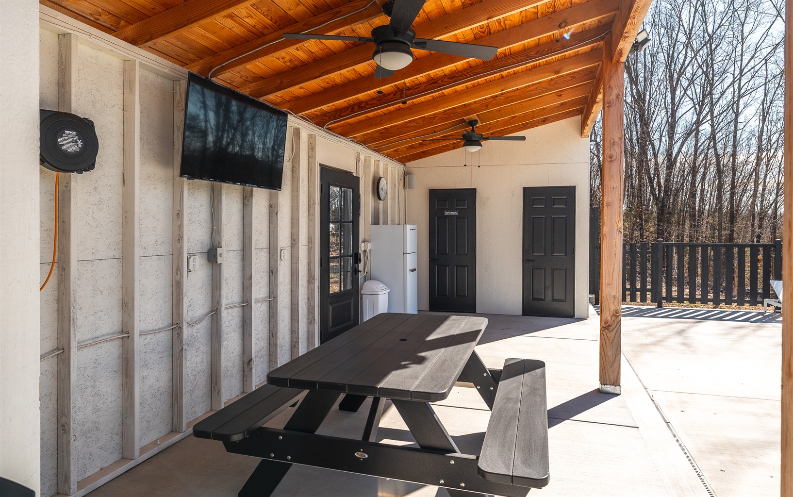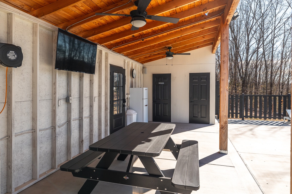 Lounge chairs, picnic table, and TV