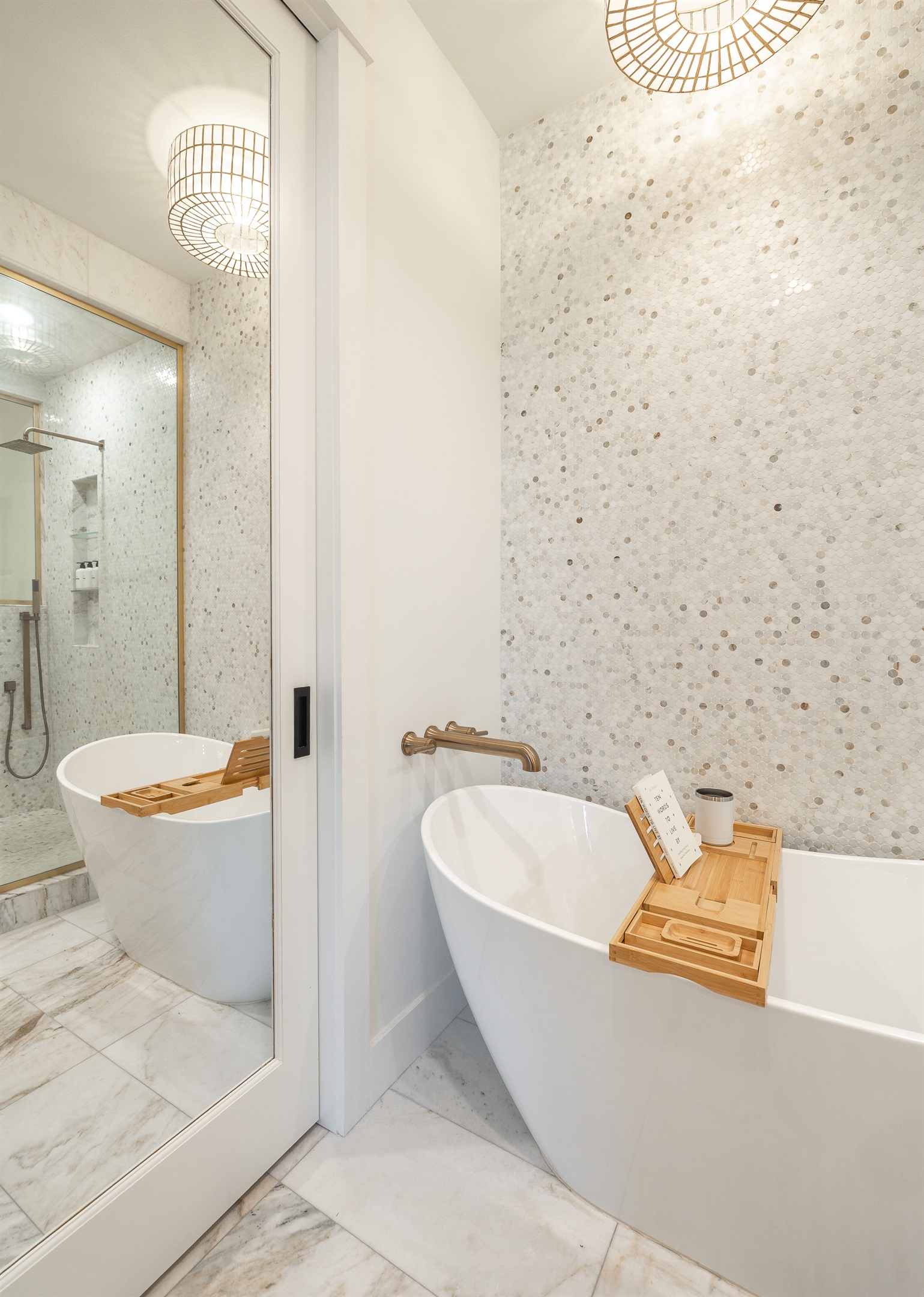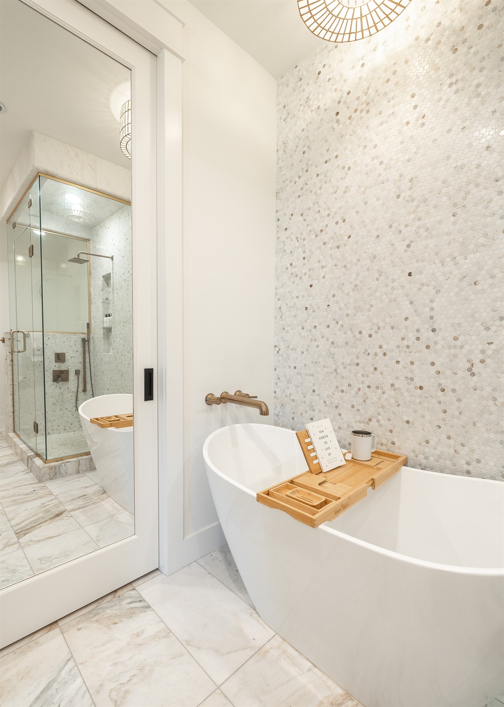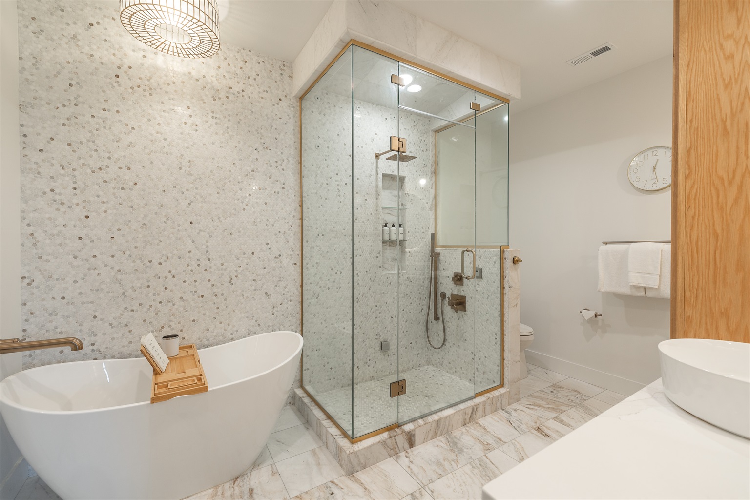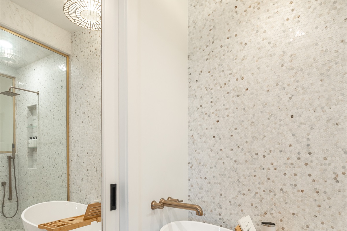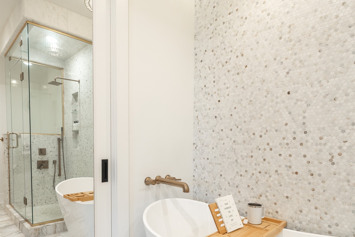 Spa-like master luxury marble ensuite with soaking tub & glass steam shower
