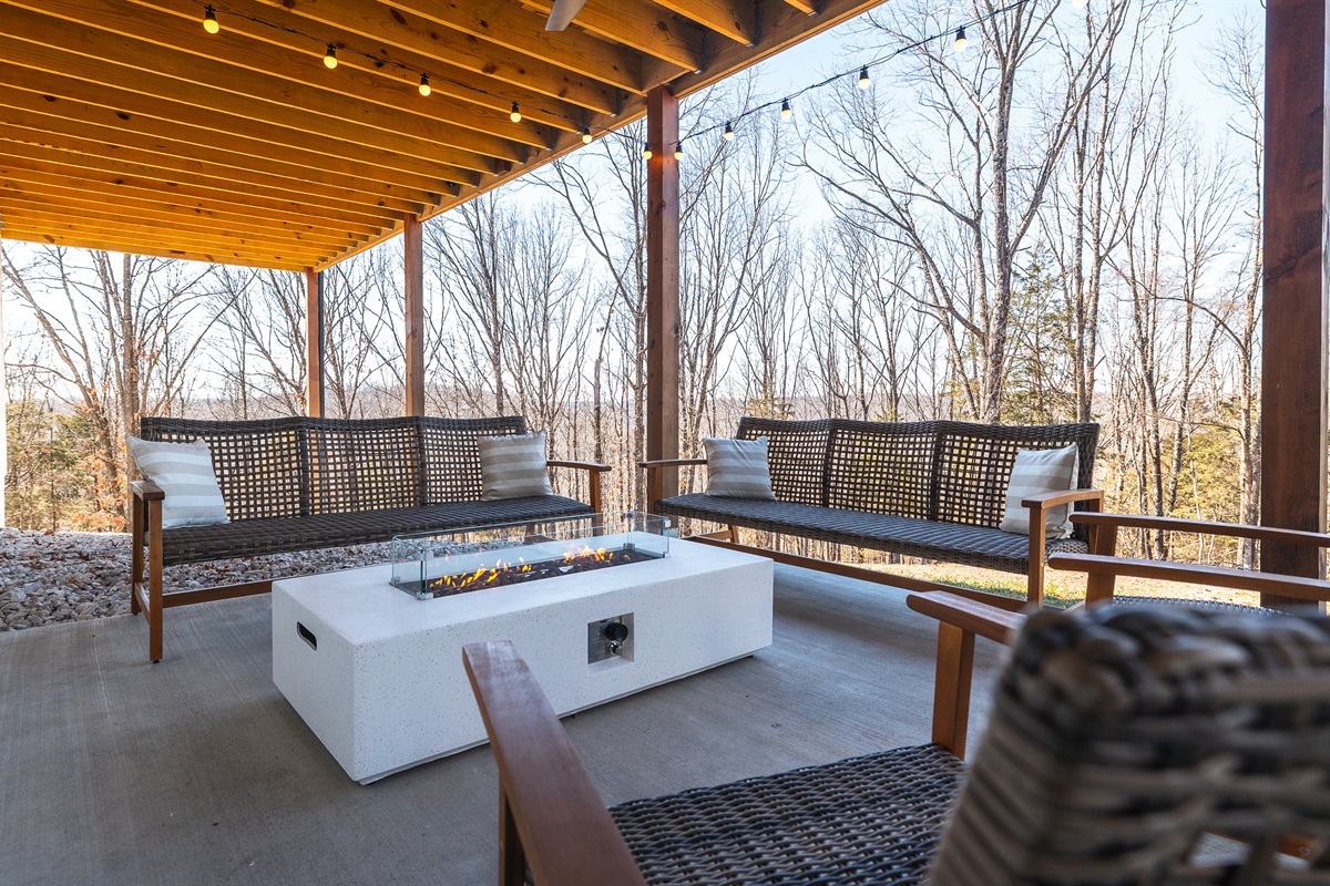 Large seating area around a gas fire table